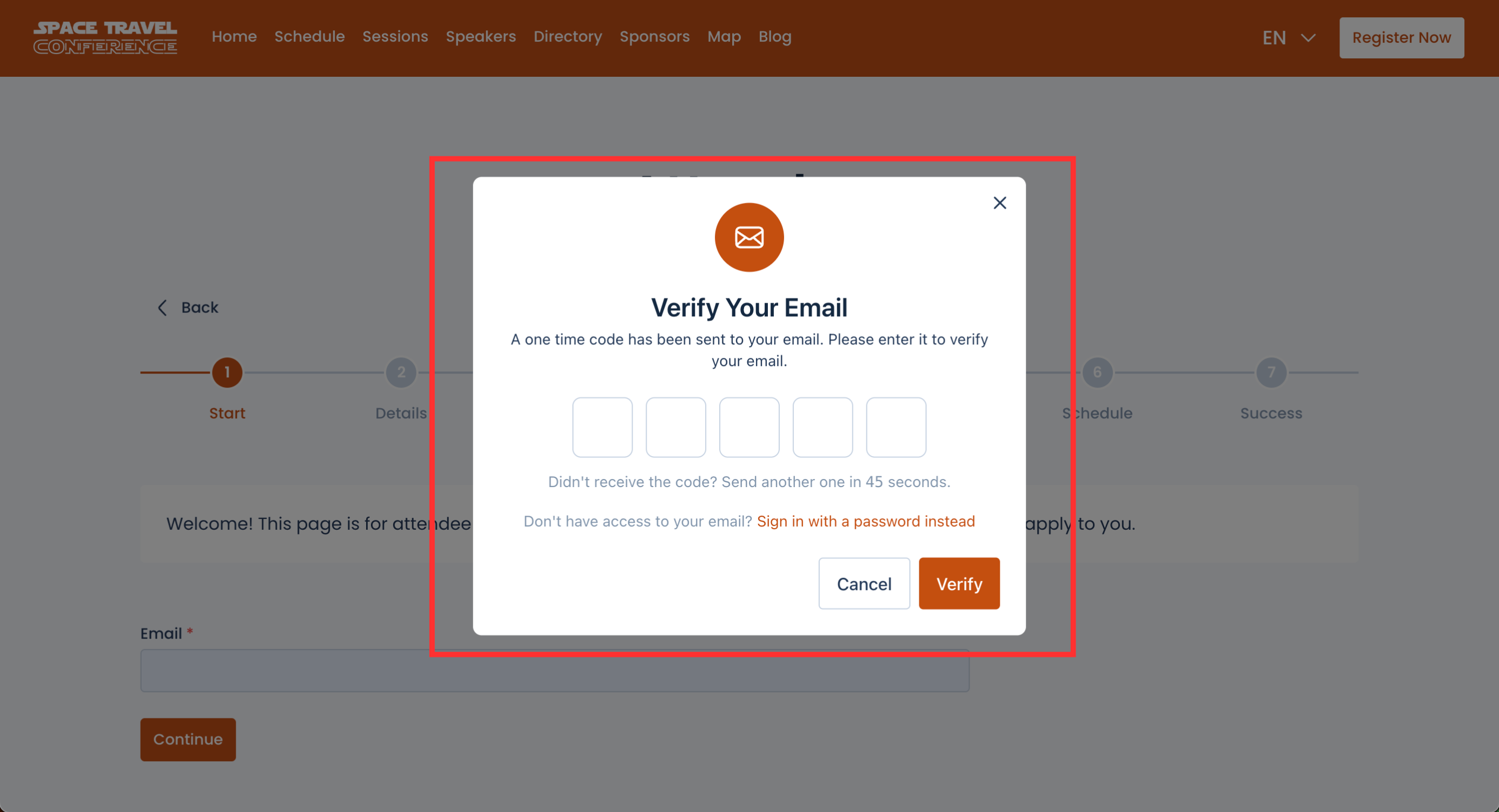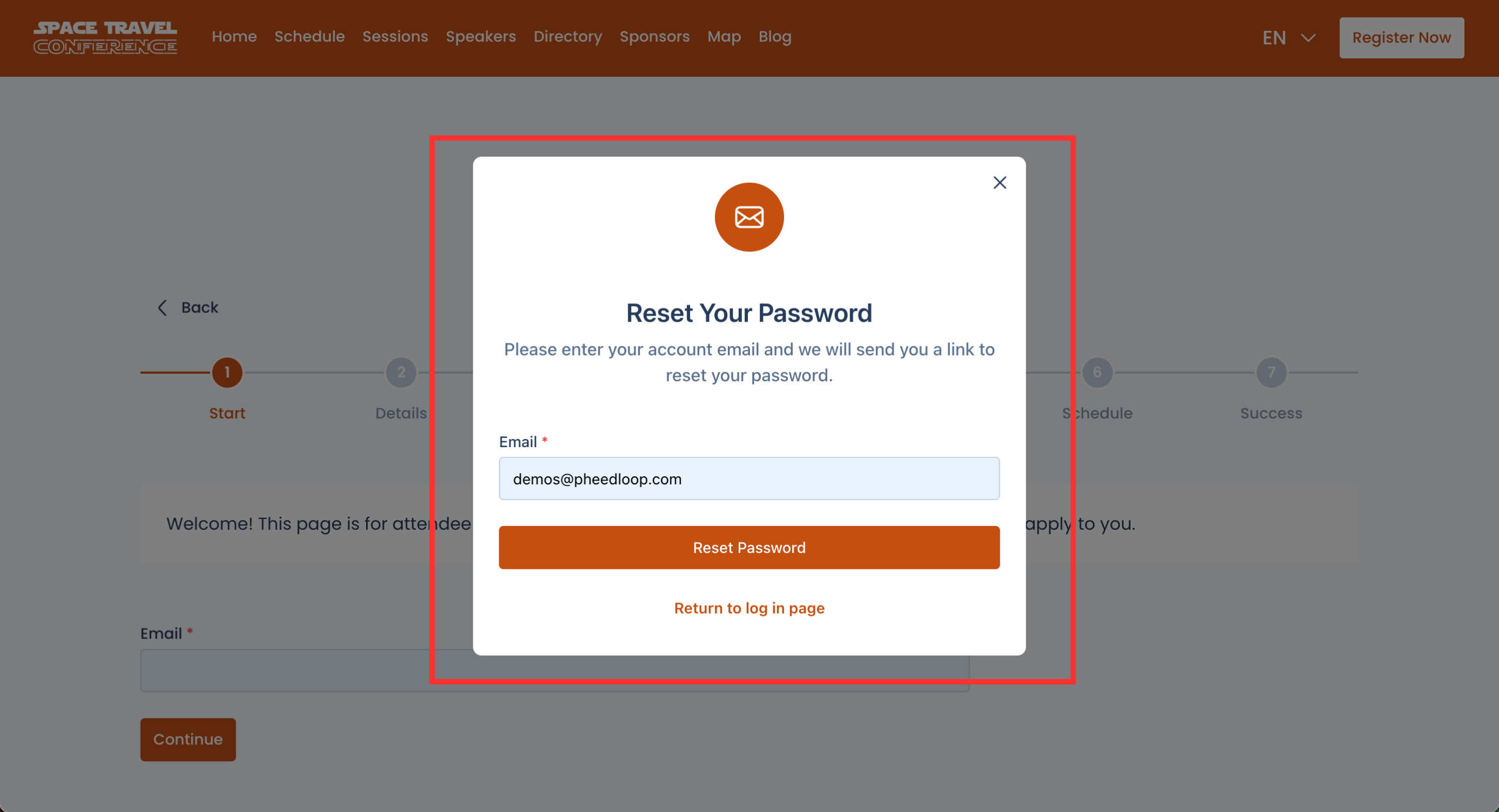 After following the above instructions, you will be taken to the registration page. If you have not already done so, you will be prompted to log in with your PheedLoop account before proceeding. You will receive a one-time login code which you can use to login to your account.