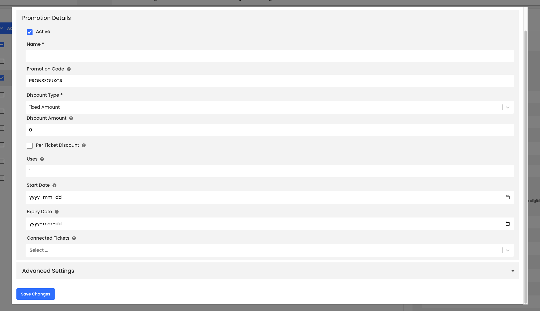 - Under Connected Tickets, choose the tickets you would like to connect to the promo code
