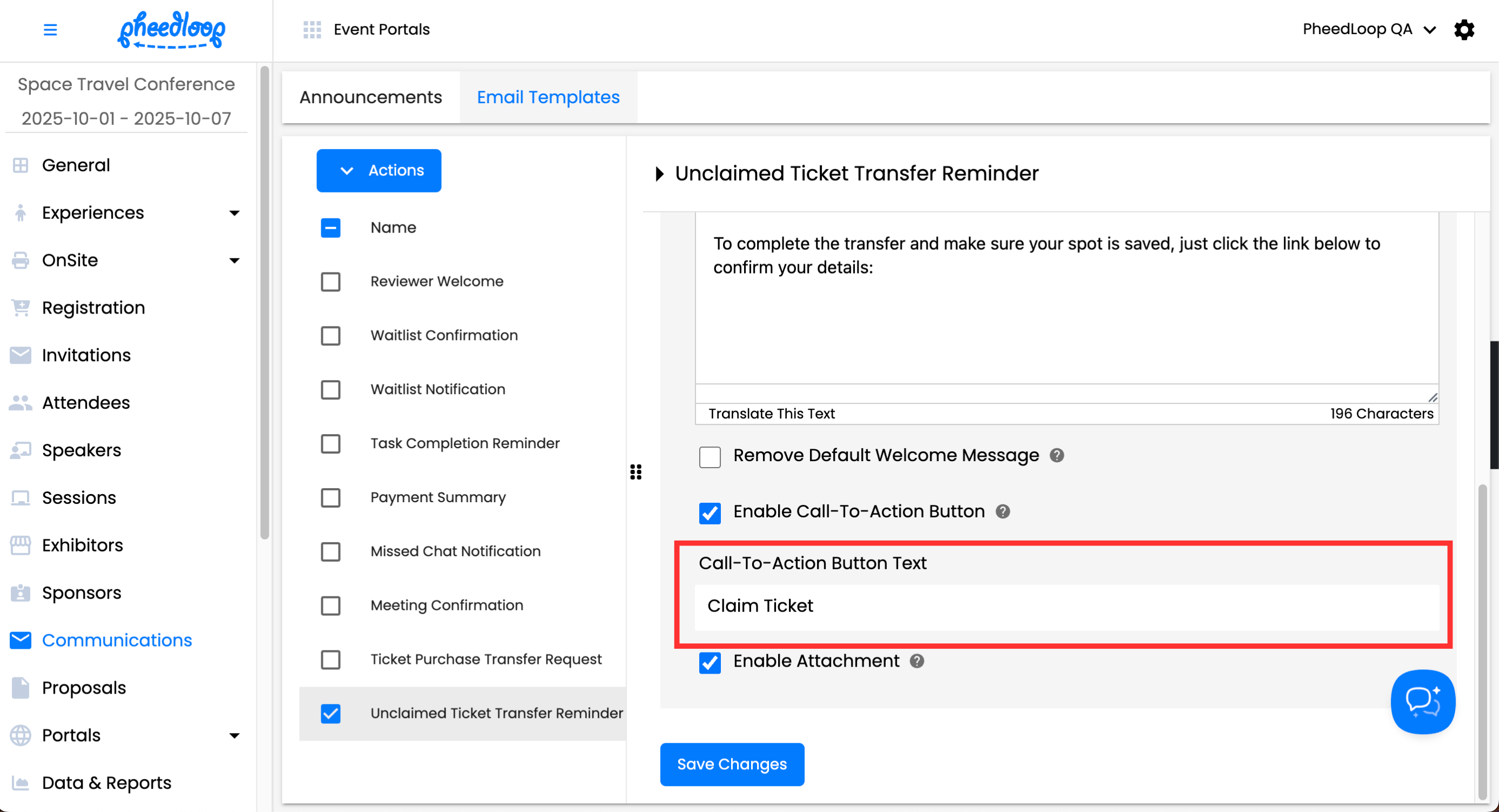 Ticket Transfers are also subject to automated email reminders. These emails can be adjusted by editing the Unclaimed Ticket Transfer Reminder Email Template under Communications > Email Templates.