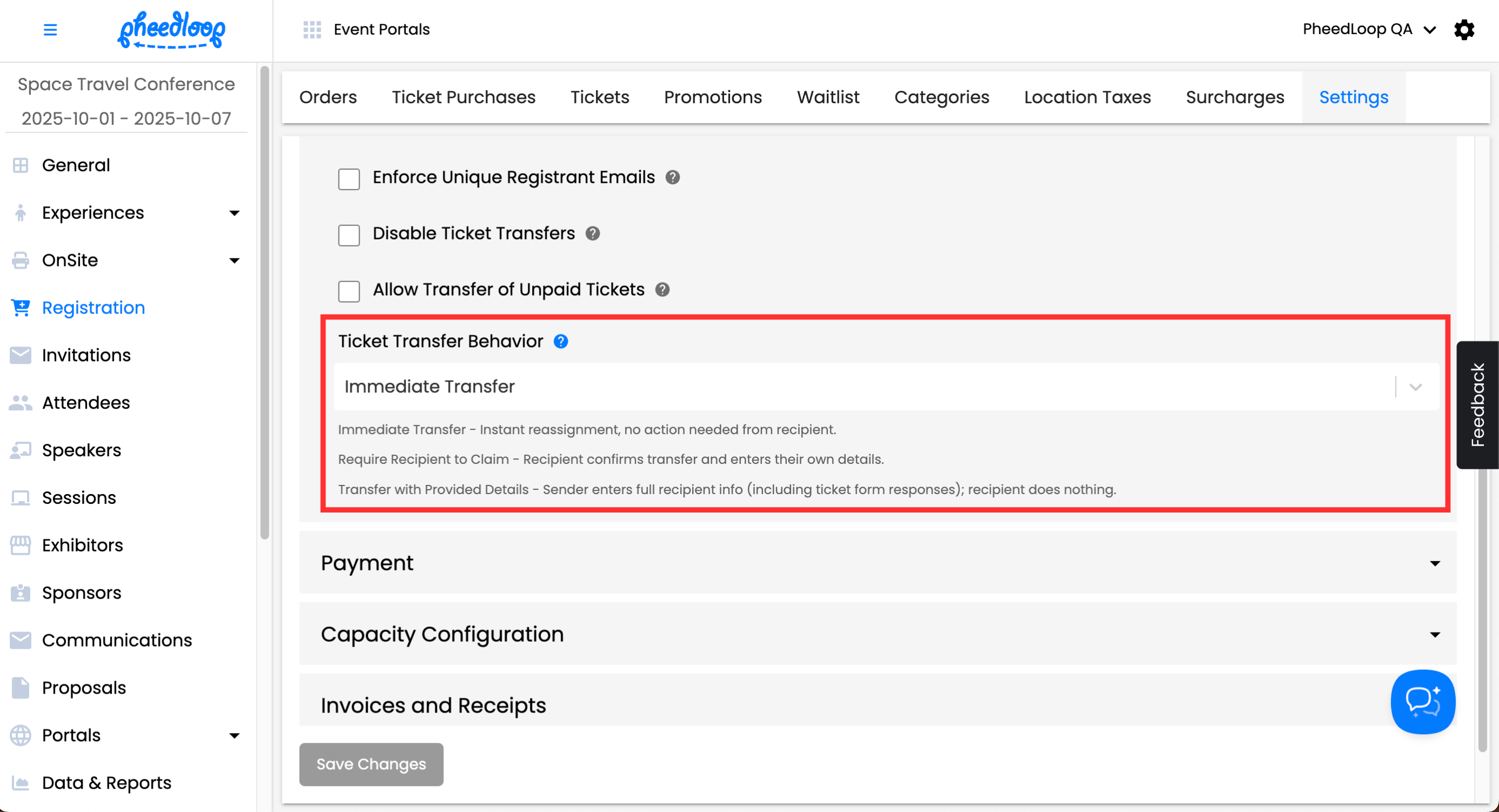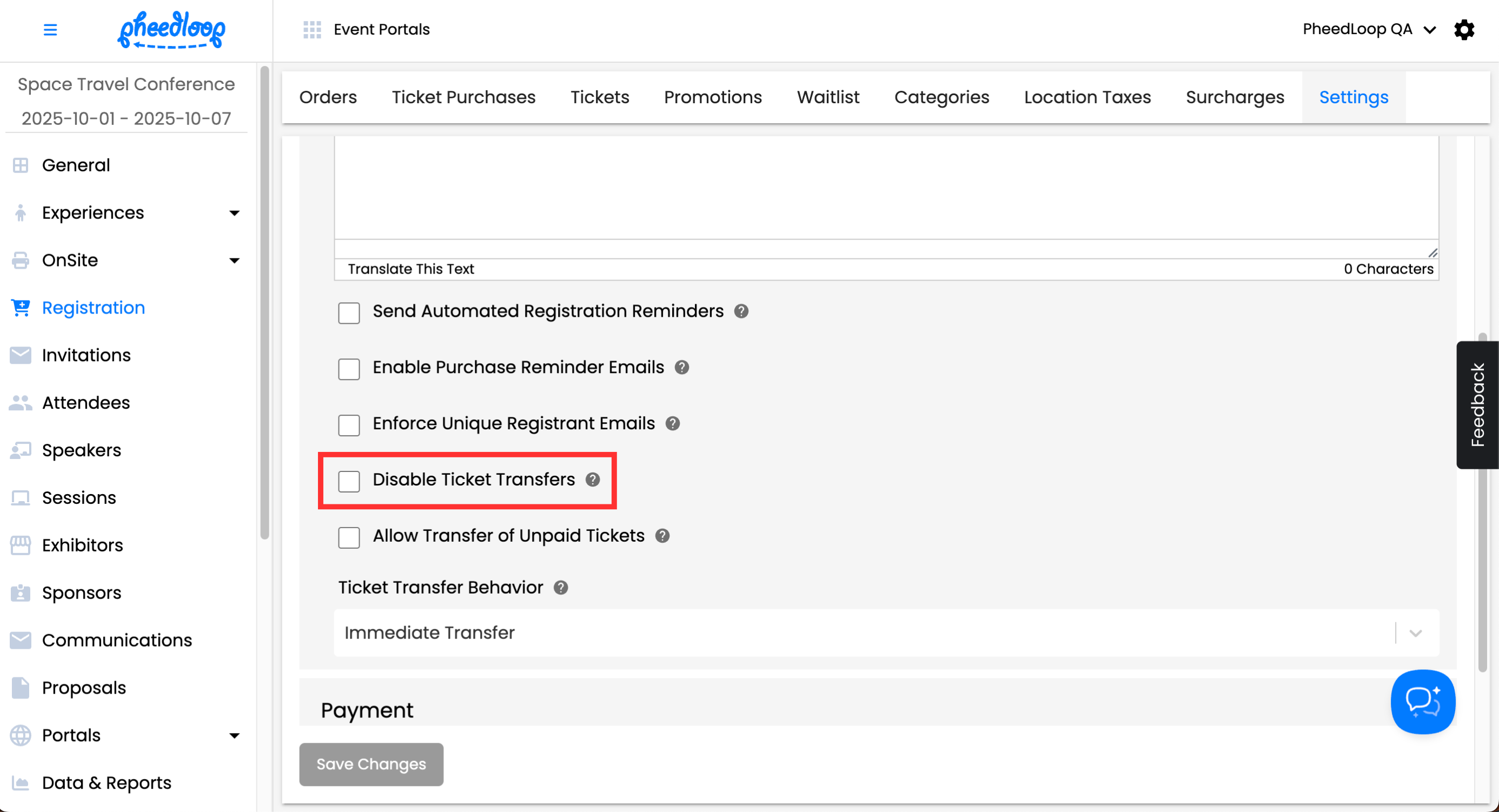 Event Administrators can prevent attendees from transferring tickets in the Event Portal. Please note, Event Administrators can still transfer tickets even if Ticket Transfers are disabled.