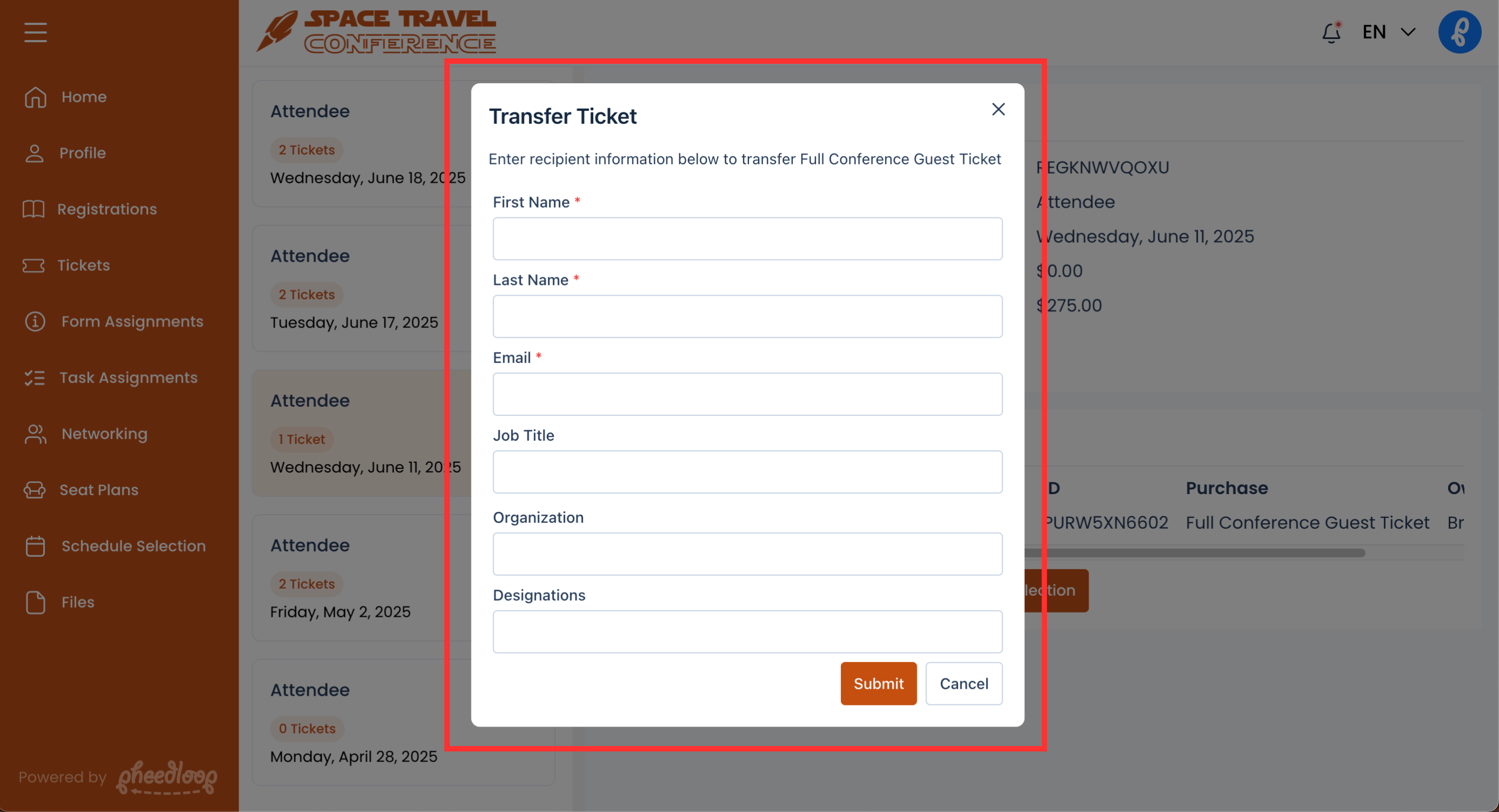 - Additional fields like Job Title, Organization, Designation, and Form Responses will appear if the Event Administrator has Transfer with Provided Details enabled.
