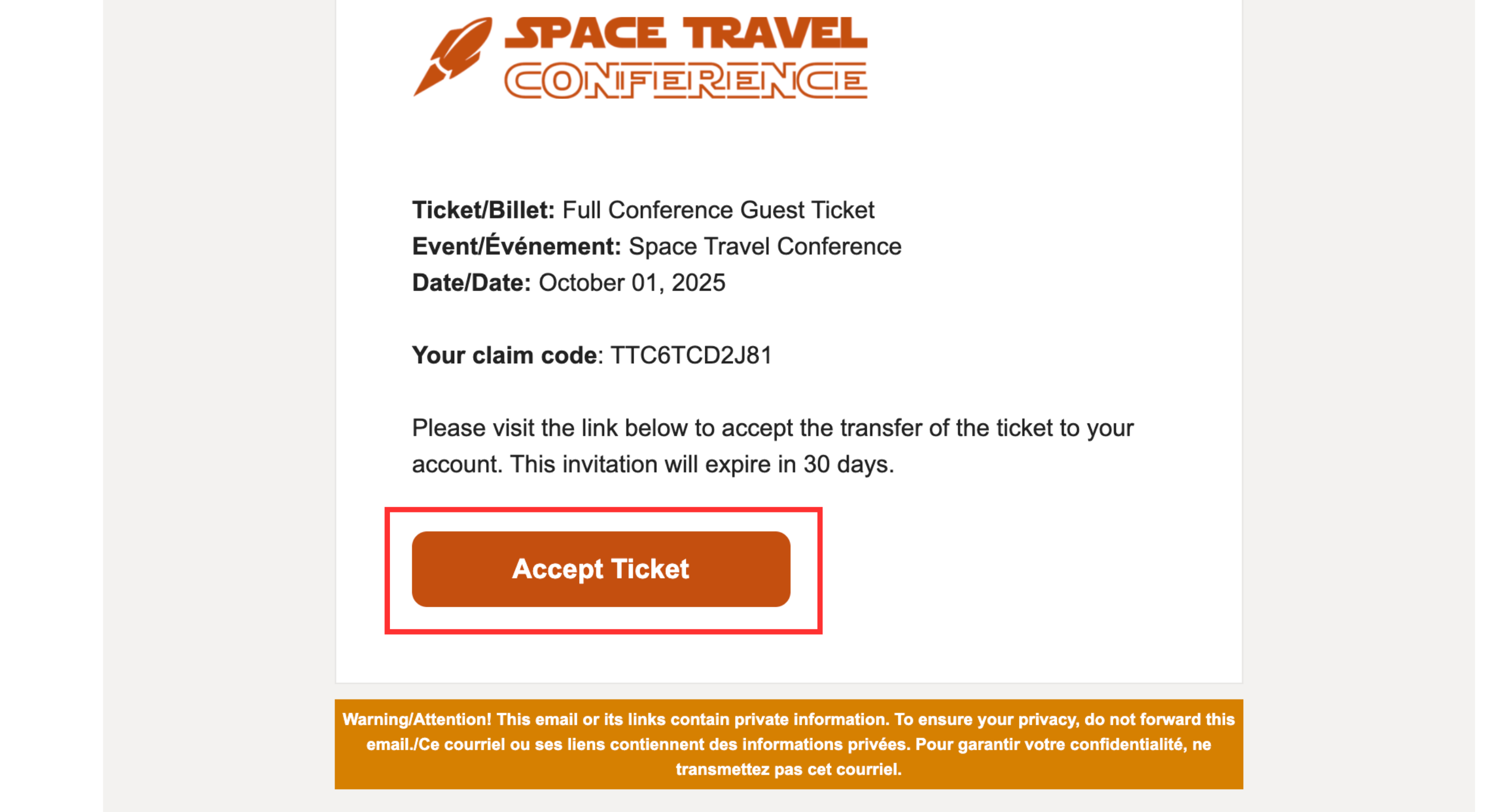 If the Event Administrator has Require Recipient to Claim enabled, the new ticket owner will need to confirm their information before the transfer process is completed. The new ticket owner will receive an email and a link to a portal where they can configure their details.