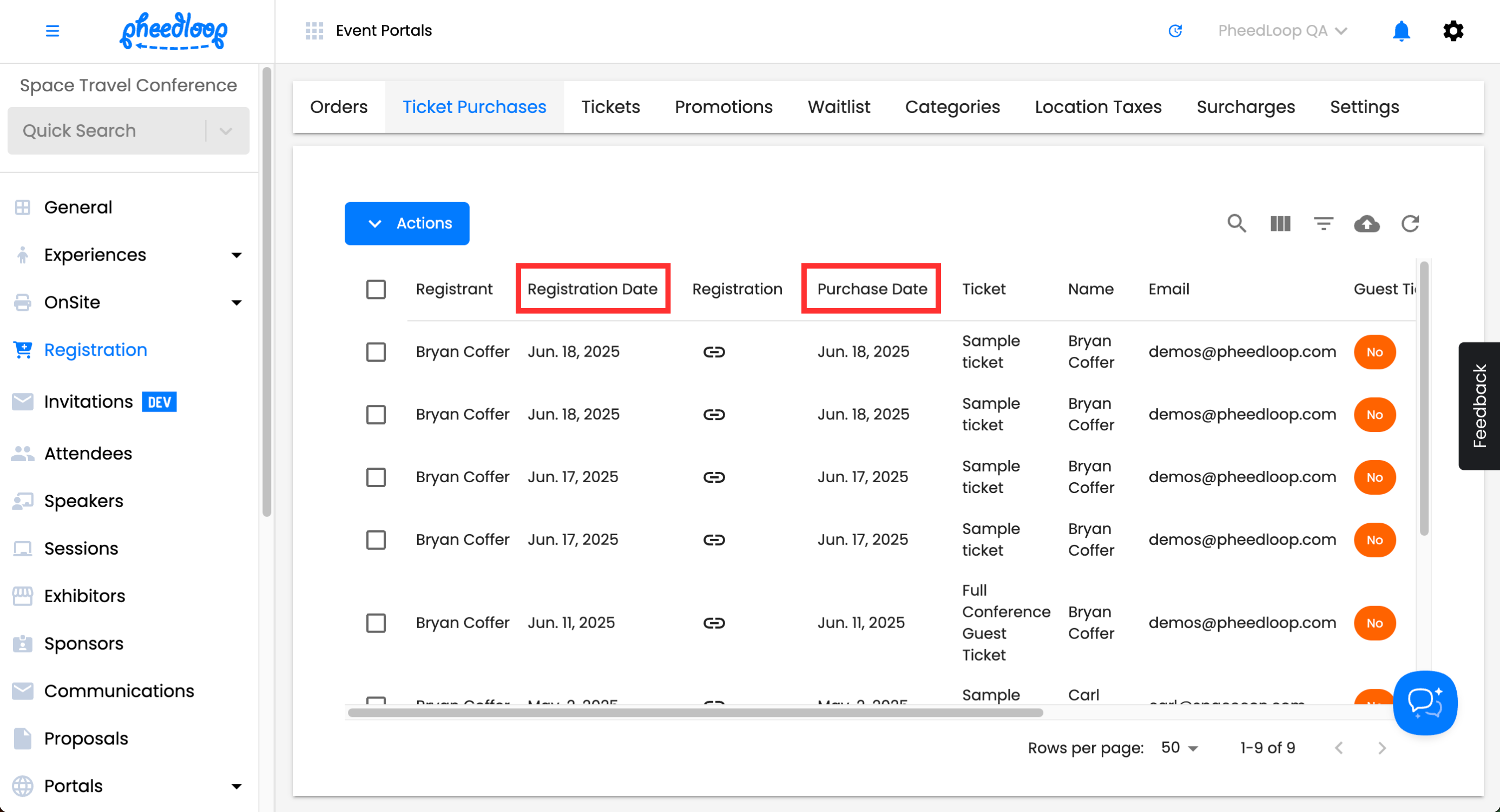 The Ticket Purchases page will display both the Registration Date and Purchase Date. The Registration Date is the date the registration order was created, whereas the Purchase Date is the date of when the ticket was added to the registration order.