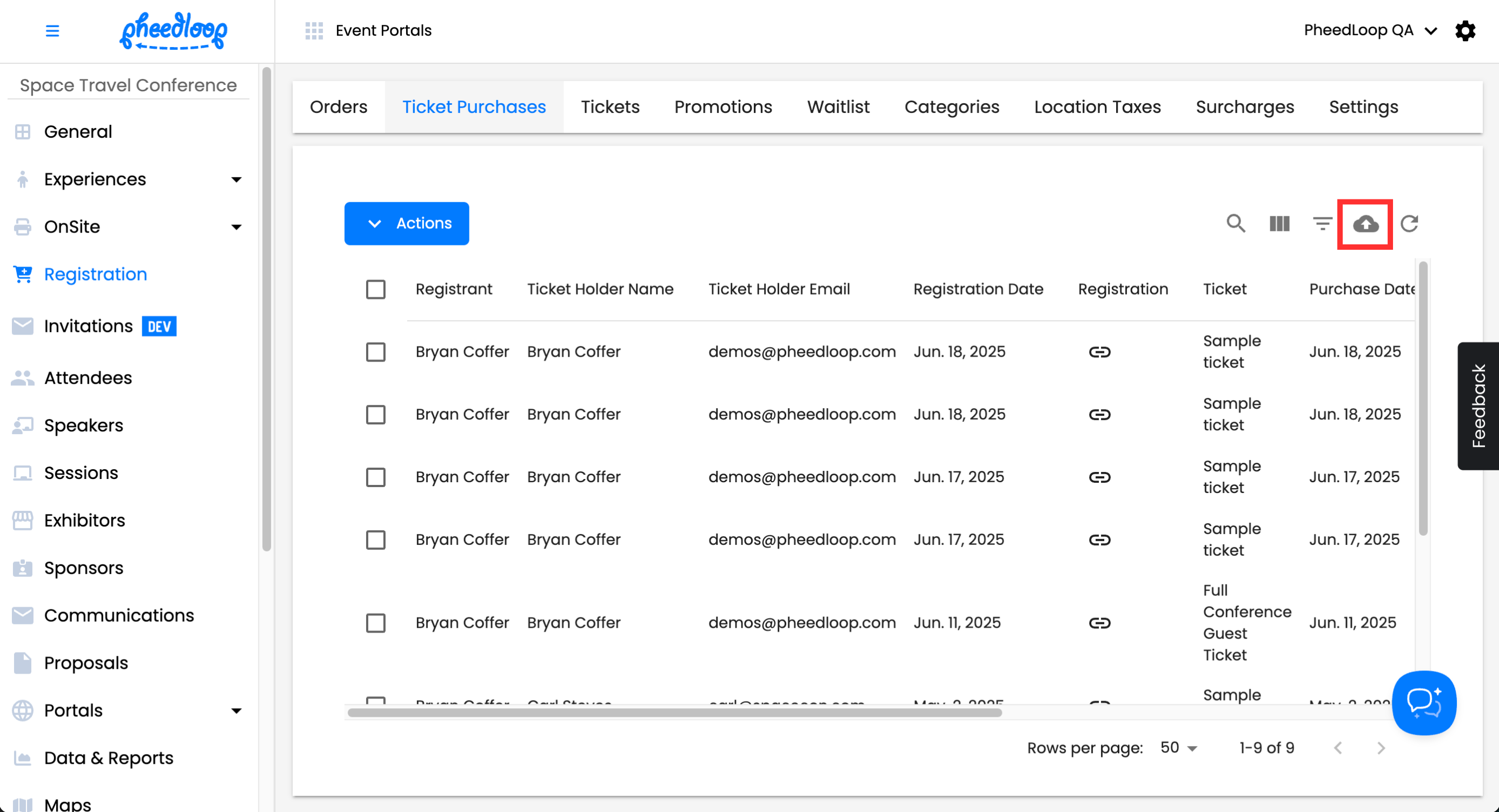 From the Event Dashboard, navigate to Registration > Ticket Purchases and select the Upload button